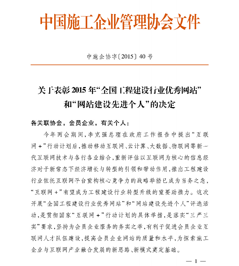 日前,在中國施工企業(yè)管理協(xié)會(huì)組織全國工程建設(shè)企業(yè)優(yōu)秀網(wǎng)站評(píng)選活動(dòng)中,我集團(tuán)經(jīng)過申報(bào)、推薦、初審、復(fù)審、審定等環(huán)節(jié),從全國工程建設(shè)企業(yè)的激烈評(píng)選中榮耀脫穎而出,在全國前100強(qiáng)網(wǎng)站中排名第59名,成功榮獲2015年“全國工程建設(shè)行業(yè)一級(jí)優(yōu)秀網(wǎng)站”;信息中心孫國帥同志榮獲2015年全國工程建設(shè)行業(yè)網(wǎng)站建設(shè)先進(jìn)個(gè)人。協(xié)會(huì)定于2015年9月22-23日在北京舉辦“全國工程建設(shè)行業(yè)首屆互聯(lián)網(wǎng)大會(huì)”,屆時(shí)將對(duì)獲獎(jiǎng)企業(yè)和個(gè)人進(jìn)行表彰,并頒發(fā)證書。