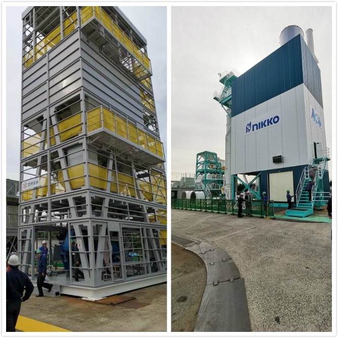 圖為日工株式會社生產(chǎn)的混凝土拌和站(左)以及瀝青拌和站(右)