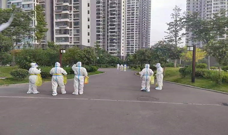 集團總部員工王軍與其他志愿者在小區做防疫工作