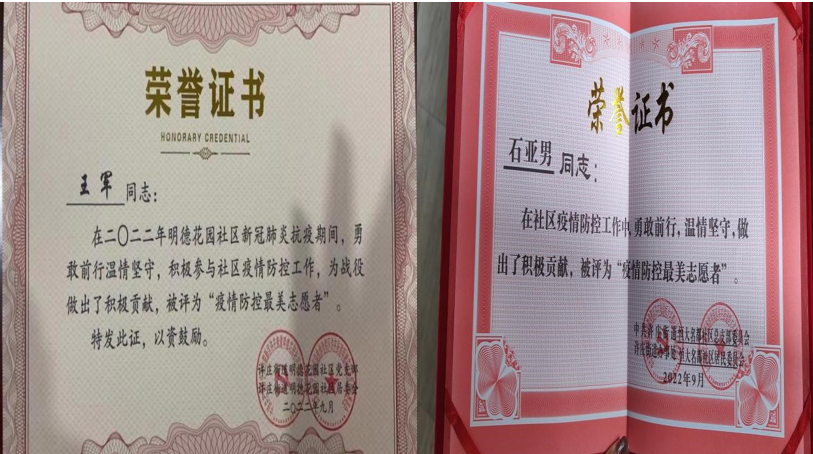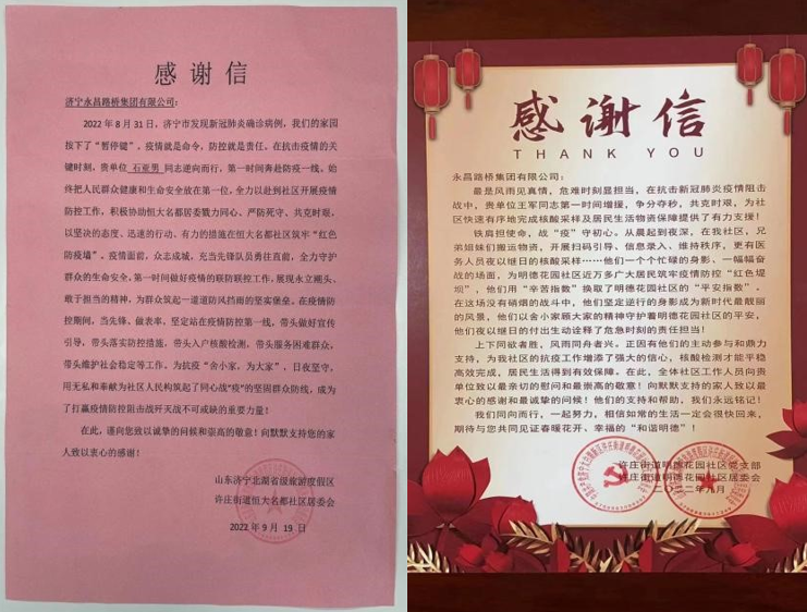 疫情得到有效控制后,集團總部收到了各個社區發來的感謝信和獎狀,信中對我公司員工在社區疫情防控中做出的突出貢獻提出書面表揚。