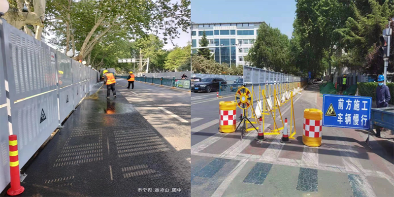 跨既有線施工,如何在組織好各工序流水施工的同時,兼顧道路順暢通行,做好疫情防控,保持周邊市容市貌是施工組織中的難點(diǎn)重點(diǎn)。對此,項(xiàng)目部制定了一系列的保障措施:一是,合理調(diào)整封閉及通行區(qū)域,全線設(shè)置導(dǎo)行標(biāo)志,安排專員現(xiàn)場引導(dǎo),保障施工周邊通行有序。對沿線路口、公園、醫(yī)院、居民小區(qū)等重要節(jié)點(diǎn),保留臨時通道,全力保障市民日常通行需求;二是,霧炮車、灑水車及噴淋系統(tǒng)晝夜不間斷作業(yè),降塵降噪,減少對周圍商業(yè)街及居民生活的影響,保障機(jī)動車及行人的舒適性,維護(hù)市容市貌。三是,積極響應(yīng)市委市政府的疫情防控要求,配備紅外測溫儀20個、醫(yī)用口罩2000個、消毒液10箱、酒精30桶等各類防疫物資,做好每日健康碼核驗(yàn)、測溫及日常消殺等疫情防控工作。