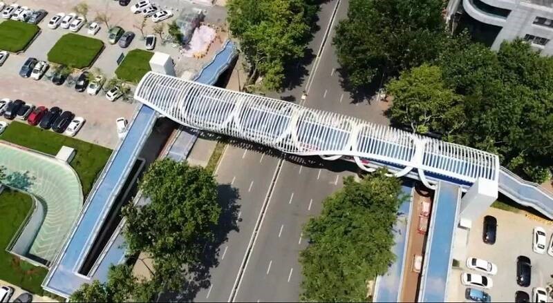 兩座天橋設(shè)計(jì)均為鋼結(jié)構(gòu)裝配式連續(xù)梁橋均配備了步行梯、垂直電梯和非機(jī)動(dòng)車坡道,使鍛煉、游玩的行人和過往車輛各行其道。