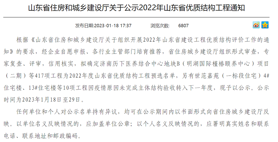 據(jù)悉,該評(píng)選活動(dòng)根據(jù)《山東省住房和城鄉(xiāng)建設(shè)廳關(guān)于組織開(kāi)展2022年山東省建設(shè)工程優(yōu)質(zhì)結(jié)構(gòu)評(píng)價(jià)工作的通知》的要求開(kāi)展,擬確定濟(jì)南歷下醫(yī)養(yǎng)結(jié)合中心地塊B( 明湖國(guó)際懂棒頤養(yǎng)中心) 項(xiàng)目(二期)等417項(xiàng)工程為2022年度山東省優(yōu)質(zhì)結(jié)構(gòu)工程預(yù)選名單,公示時(shí)間為2023年1月18日至29日,現(xiàn)已公示完畢。濟(jì)寧市獲得此榮譽(yù)稱號(hào)的市政工程為3例。
