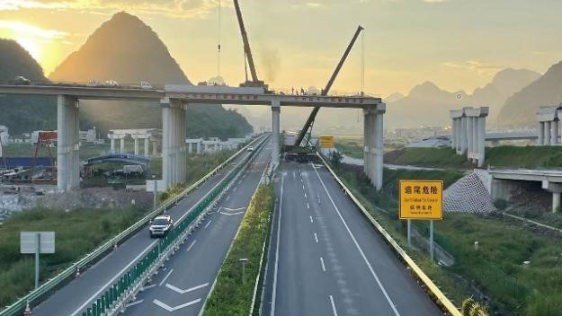 項目快訊|貴港西外環姚山樞紐互通上跨貴隆高速預制箱梁架設任務圓滿完成