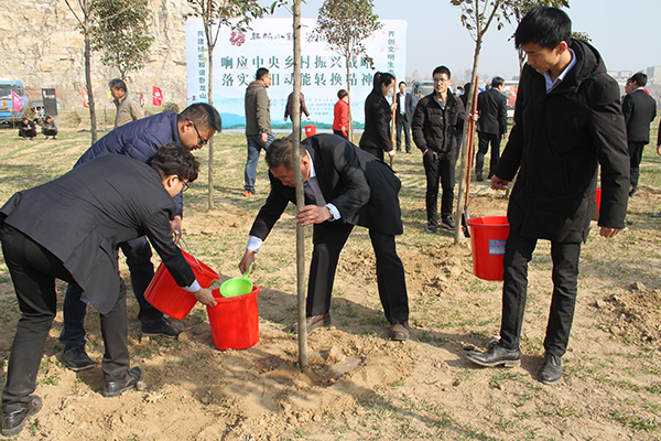 啟動(dòng)儀式結(jié)束后,以“響應(yīng)中央鄉(xiāng)村振興戰(zhàn)略、落實(shí)新舊動(dòng)能轉(zhuǎn)換精神”為主題,永昌集團(tuán)、中建交通、鳳凰城置業(yè)有限公司、山東天下吉祥華鐵旅游文化有限公司及嘉祥縣各級(jí)政府領(lǐng)導(dǎo)干部職工共計(jì)200余人,在臥龍山景區(qū)麒麟小鎮(zhèn)項(xiàng)目建設(shè)現(xiàn)場(chǎng)開展集中植樹活動(dòng)。